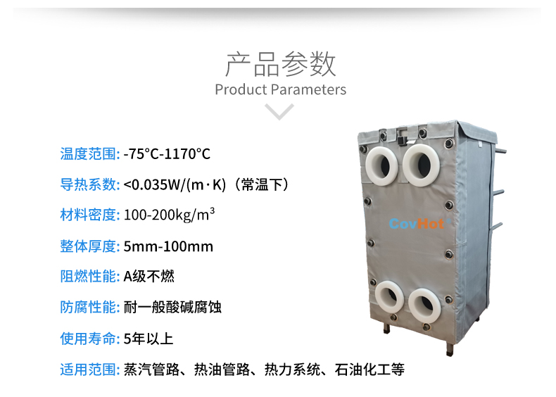 針對以上的問題,河北科好特科技有限責任公司自主研發的節能型板換保溫衣,可以有效減少換熱器的熱量損耗,而且在施工過程中安裝拆卸方便,節省人工,可拆卸保溫衣還可重復使用,起到節能降耗的效果。科好特可拆卸保溫衣根據設備不同的尺寸形狀量身定制,可廣泛用于換熱器、閥門、管道及其它需要保溫或防凍的領域。